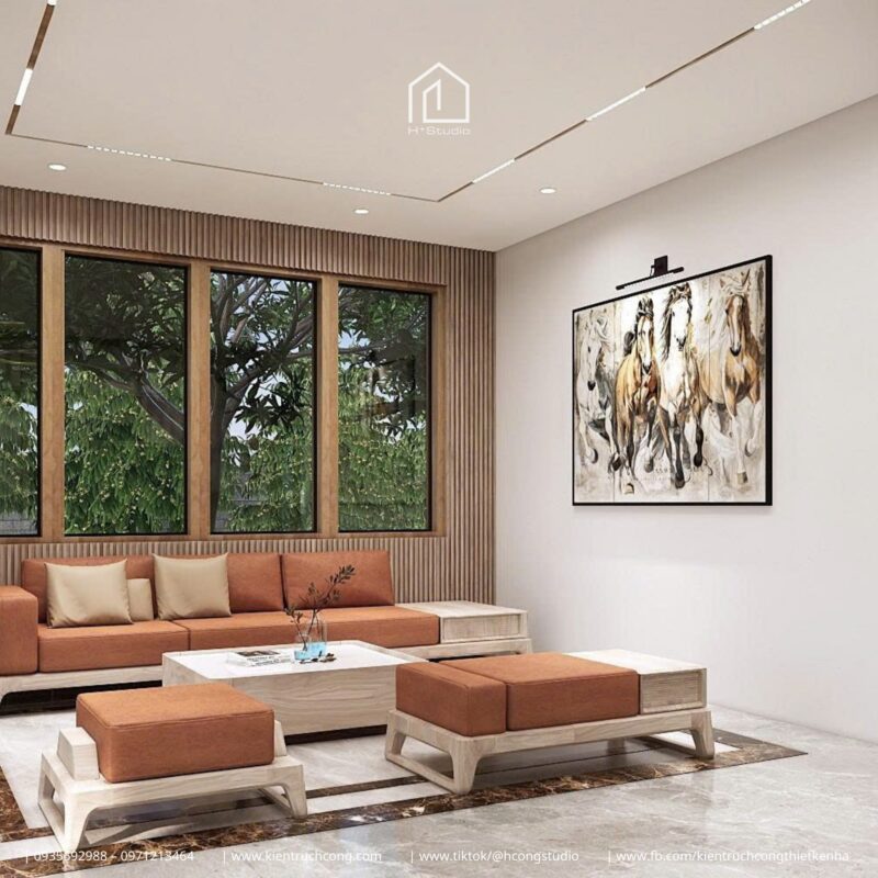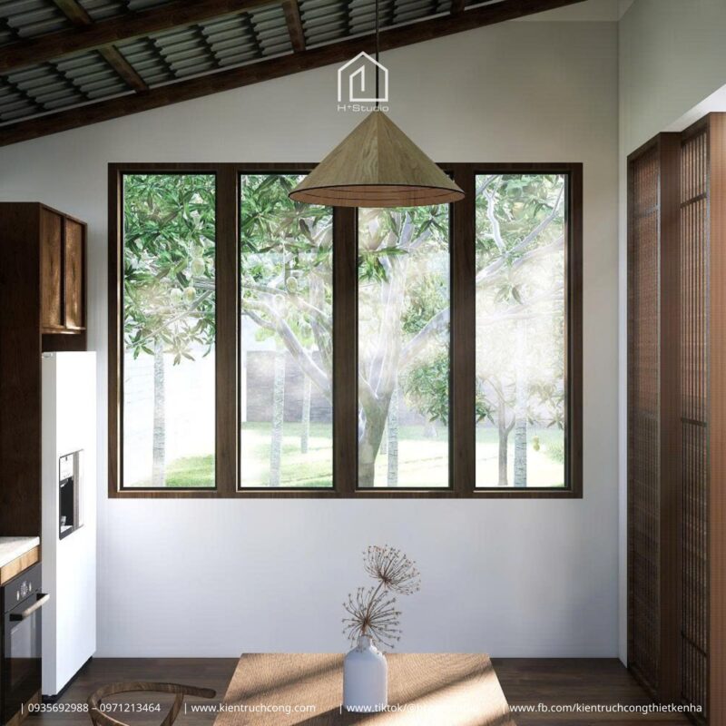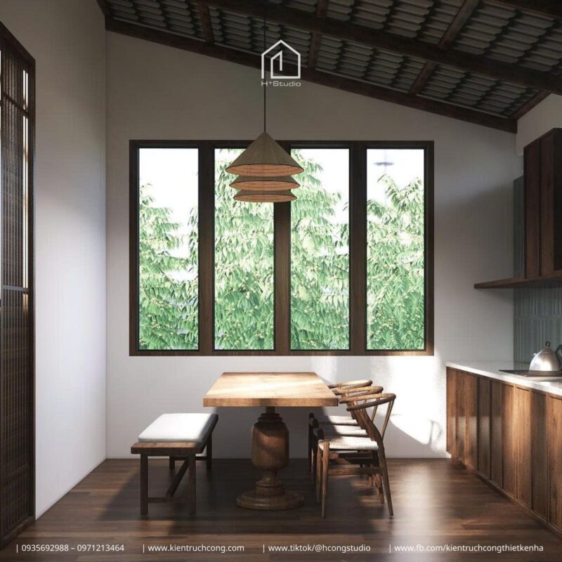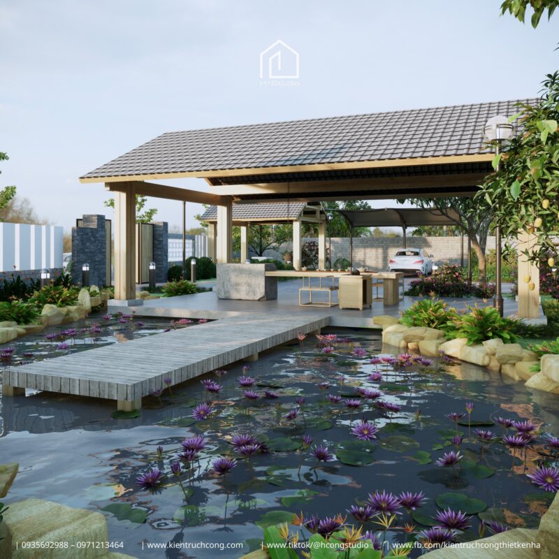 Điểm nhấn đầu tiên khi bước vào là hồ sen rộng thoáng ngay trước hiên nhà – không chỉ gợi nhớ ký ức tuổi thơ bên làng quê yên ả, mà còn phản ánh tính cách của gia chủ: trầm tĩnh, sâu sắc và luôn tìm kiếm sự cân bằng trong đời sống.