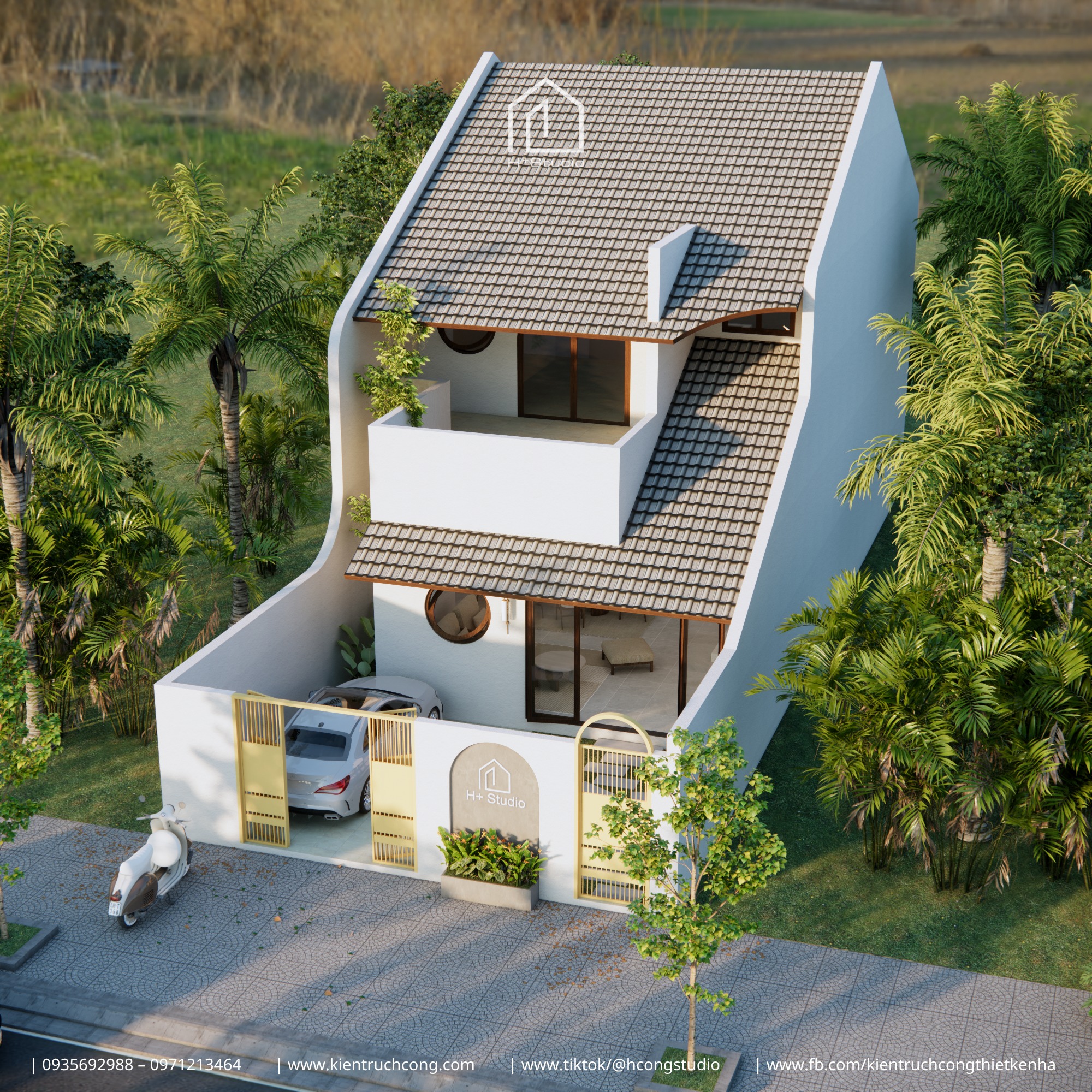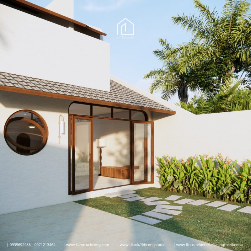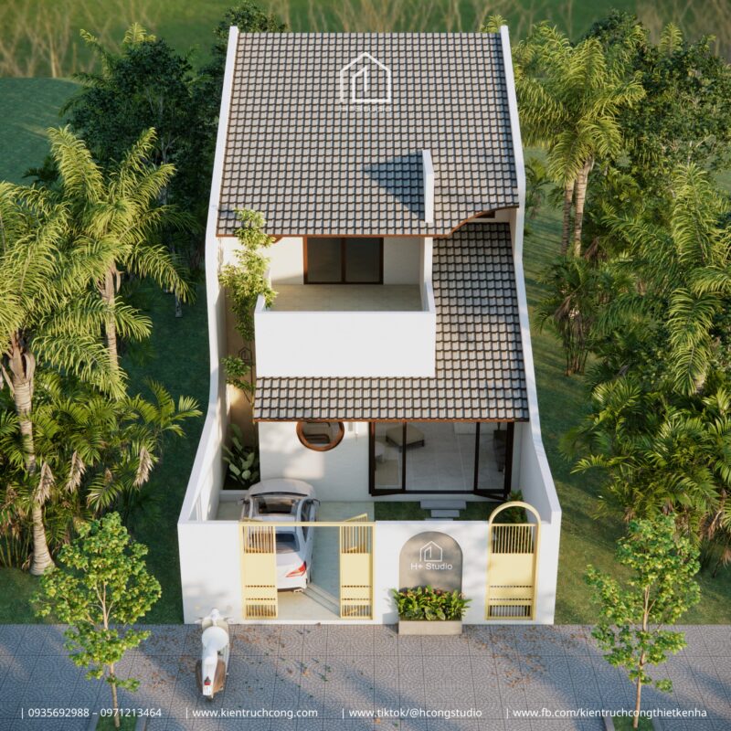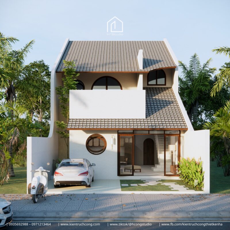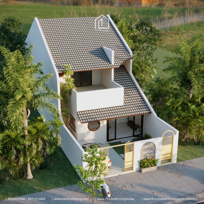 Với thiết kế gác lửng mái dốc, ngôi nhà nổi bật giữa thiên nhiên xanh mát – nơi ánh sáng và gió trời len lỏi qua từng góc nhỏ.