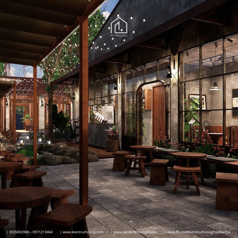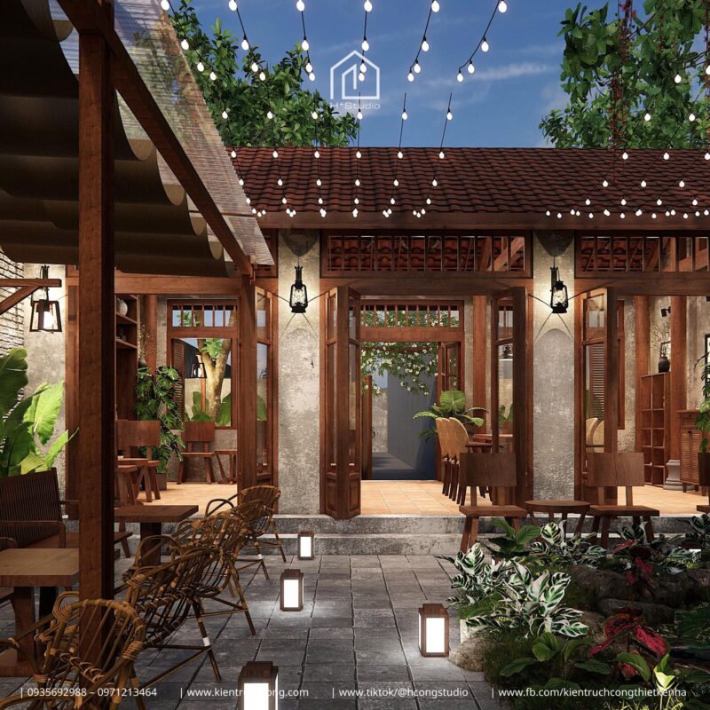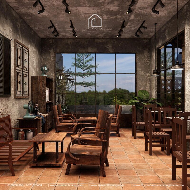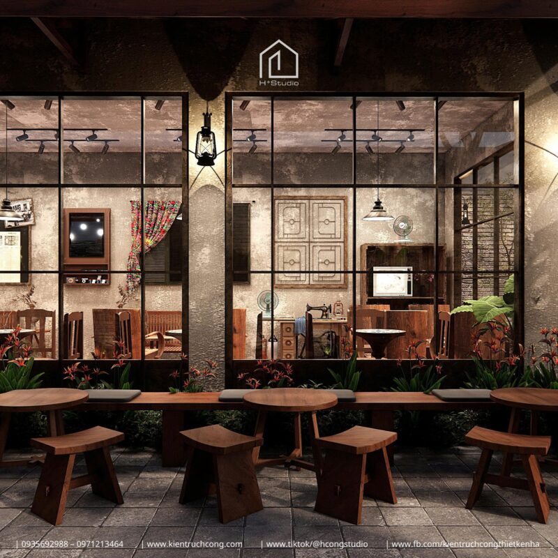Vừa là nơi kinh doanh cà phê, vừa là không gian sưu tầm và trưng bày đồ cổ, dự án gây ấn tượng mạnh bởi sự kết hợp hài hòa giữa cổng vòm gạch cổ kính, mái gỗ nâu ấm và những góc bày biện đồ xưa đầy tinh tế.
