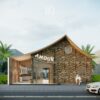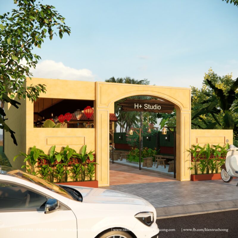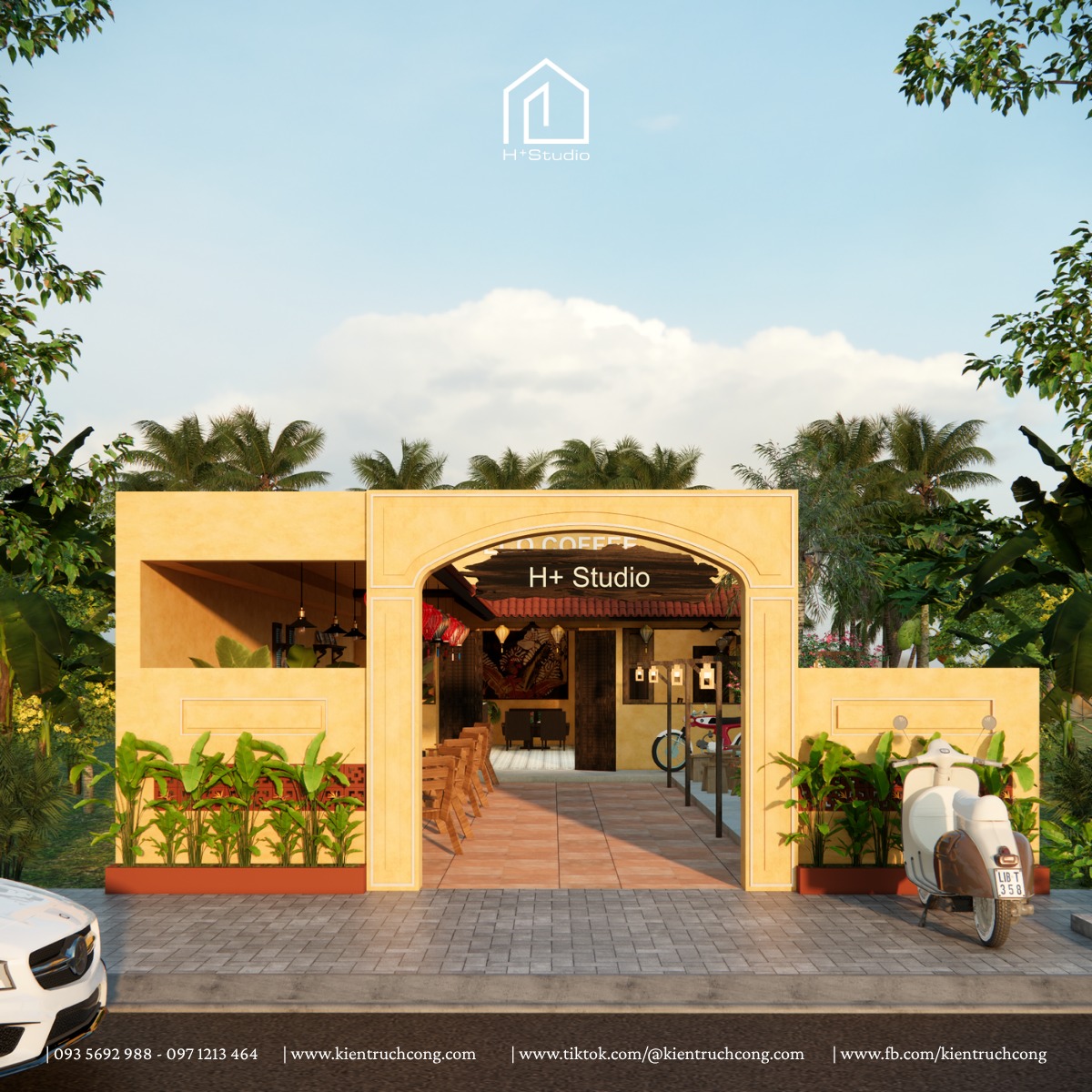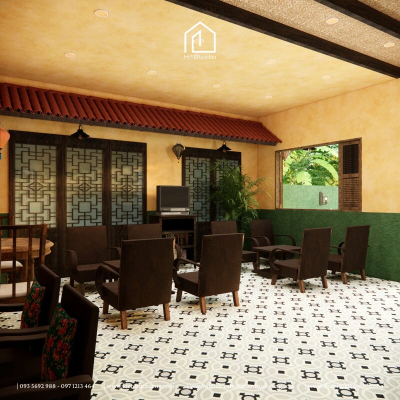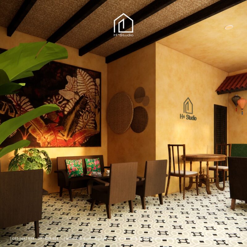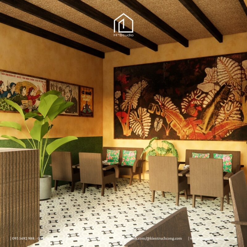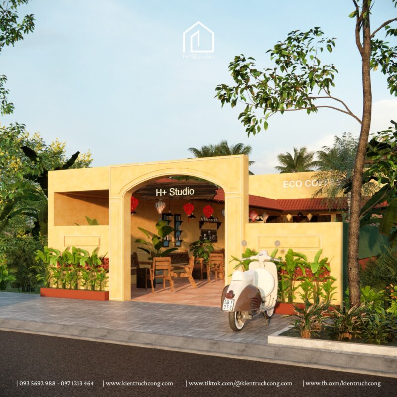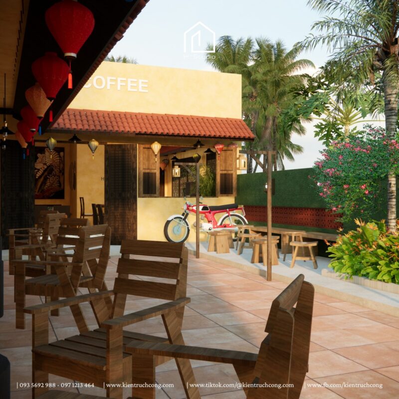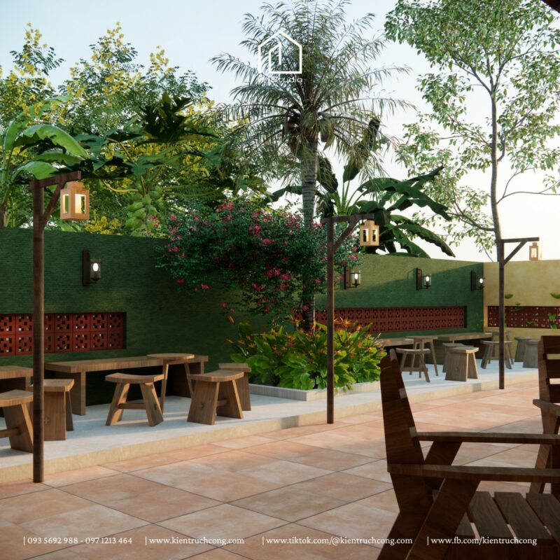 Một công trình mang theo cả ký ức và cảm xúc – nơi tái hiện không gian quán xưa với gam màu vàng đất, mái ngói nâu, đèn lồng, xe Cub và từng mảng tường gạch bông gió thân quen.