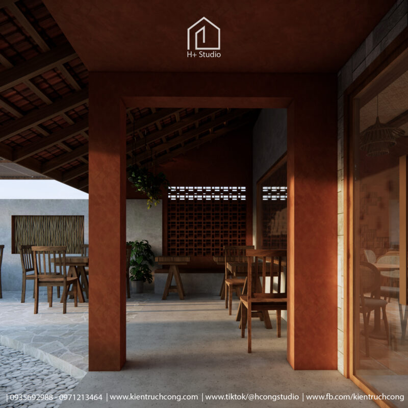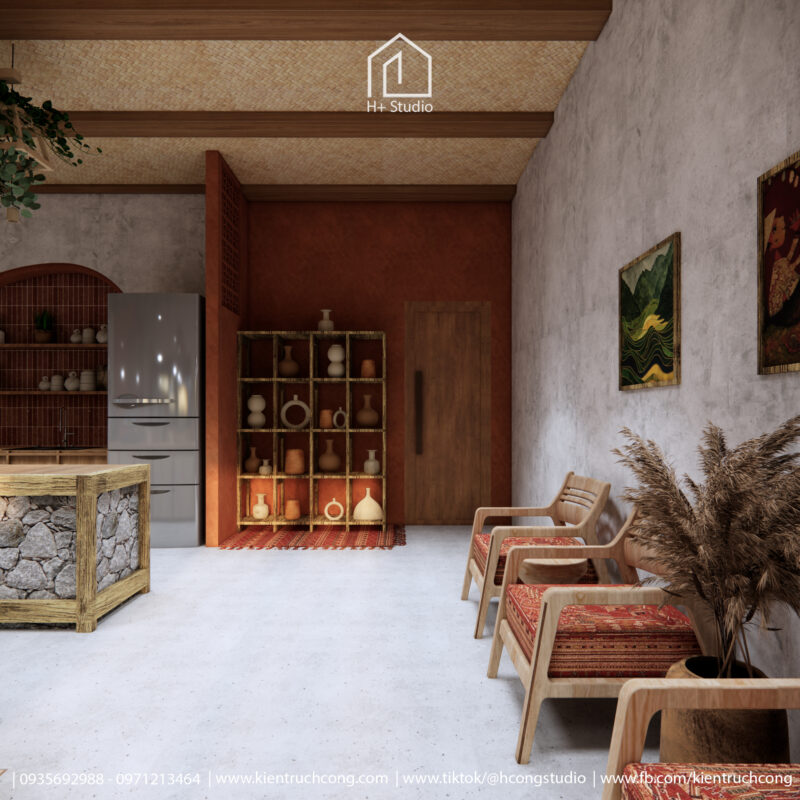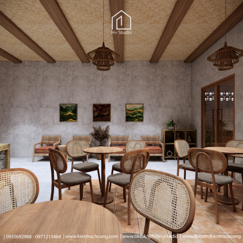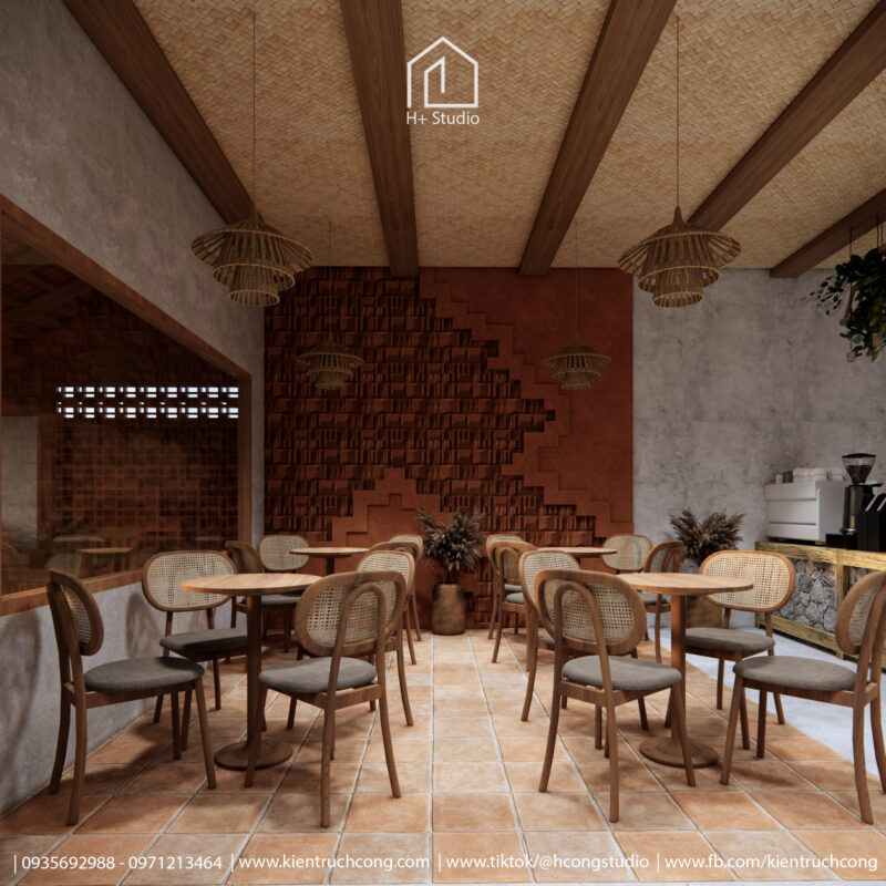 Nội thất sử dụng bàn ghế gỗ tối màu, mái ngói đỏ và trần tre đan – tạo cảm giác gần gũi, dân dã nhưng vẫn độc đáo