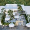 Dù trắng, đèn cong ánh vàng & cây bóng mát – giữ không khí dễ chịu cả ngày lẫn tối.