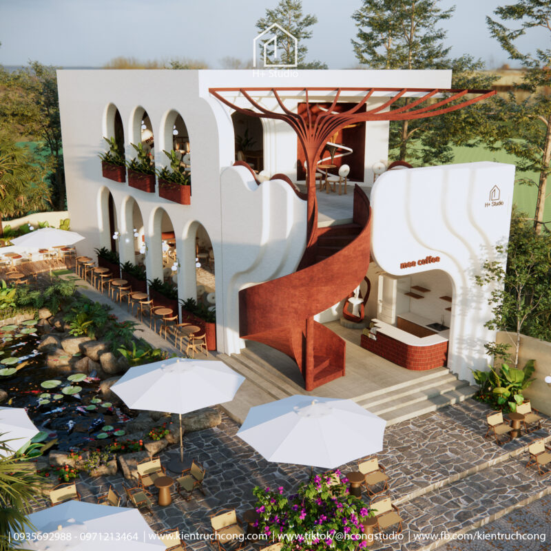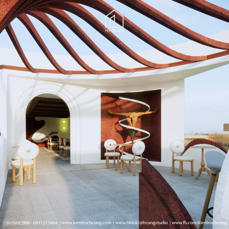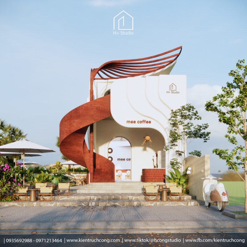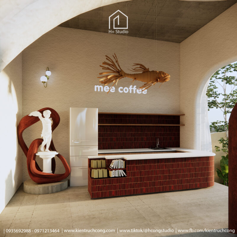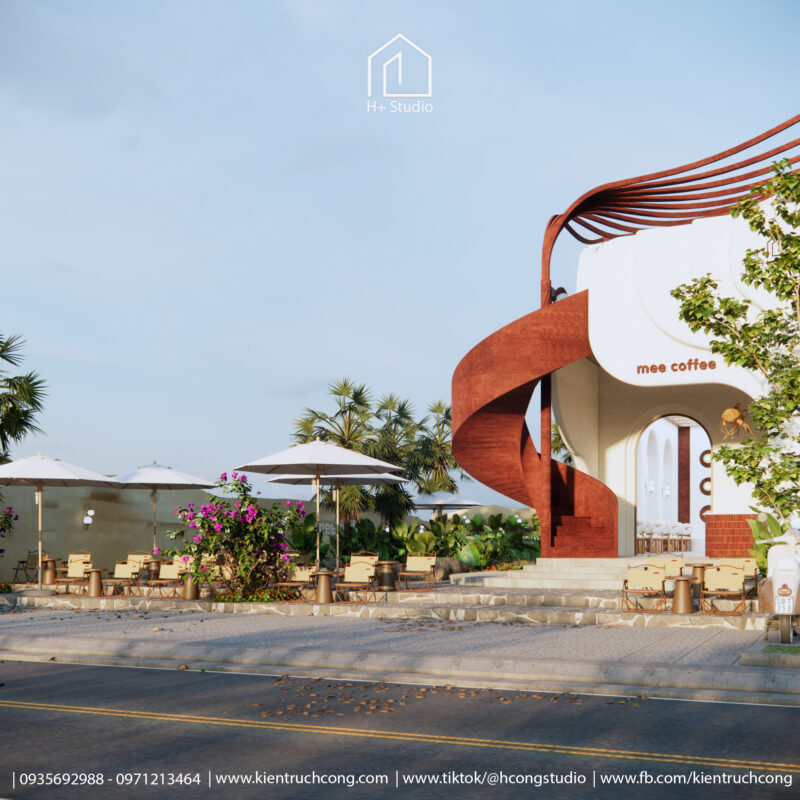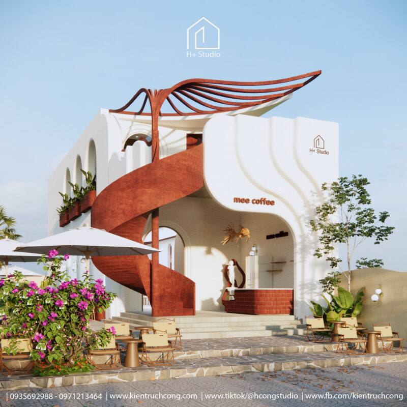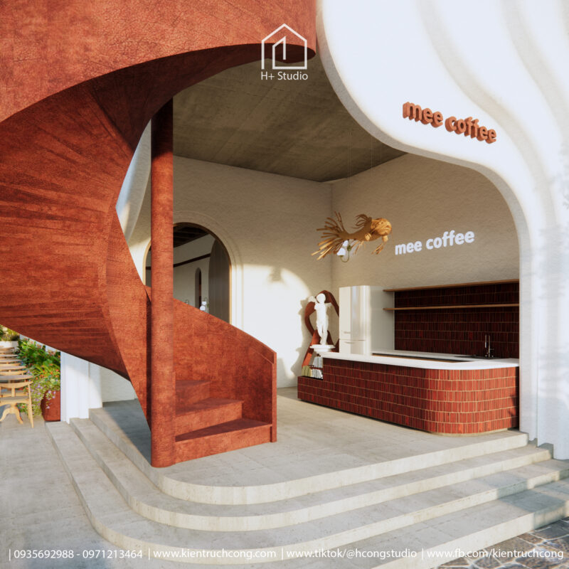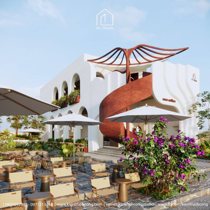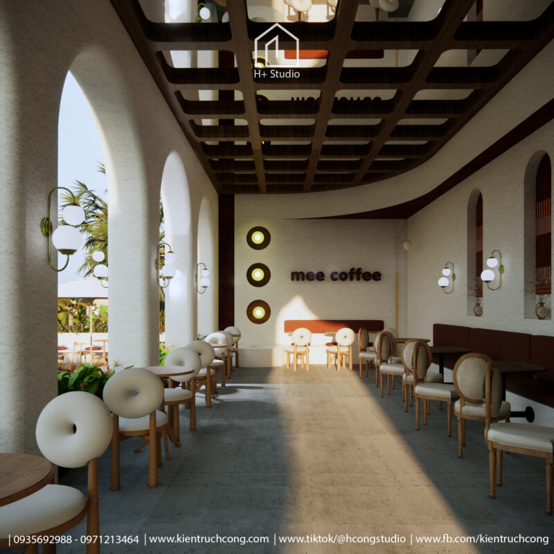 Mee Coffee là công trình do H Cộng thiết kế, kết hợp hài hòa giữa kiến trúc vòm Địa Trung Hải và không gian sân vườn xanh mát. Quán mang đến cảm giác vừa sang trọng vừa gần gũi, nơi khách hàng có thể trải nghiệm cà phê trong một khung cảnh tinh tế, đầy cảm hứng.
