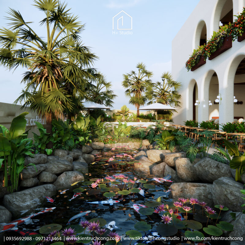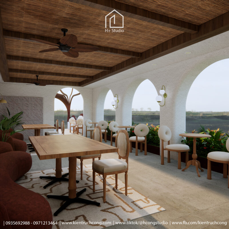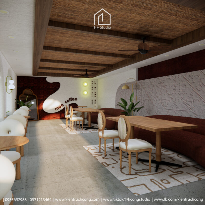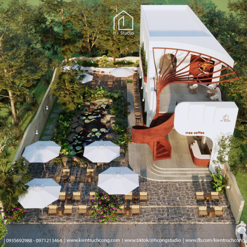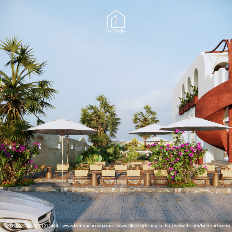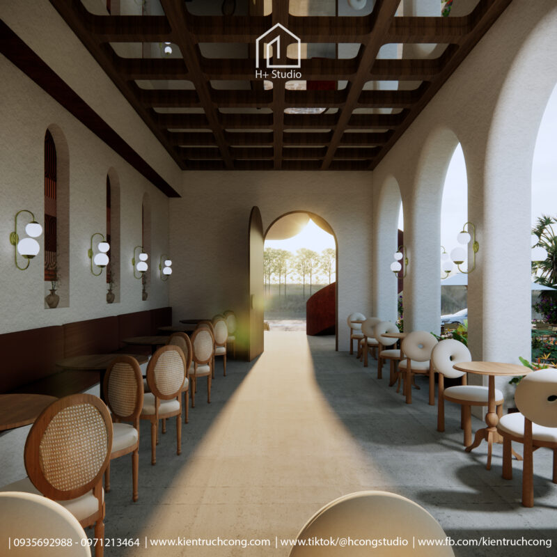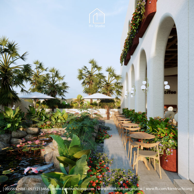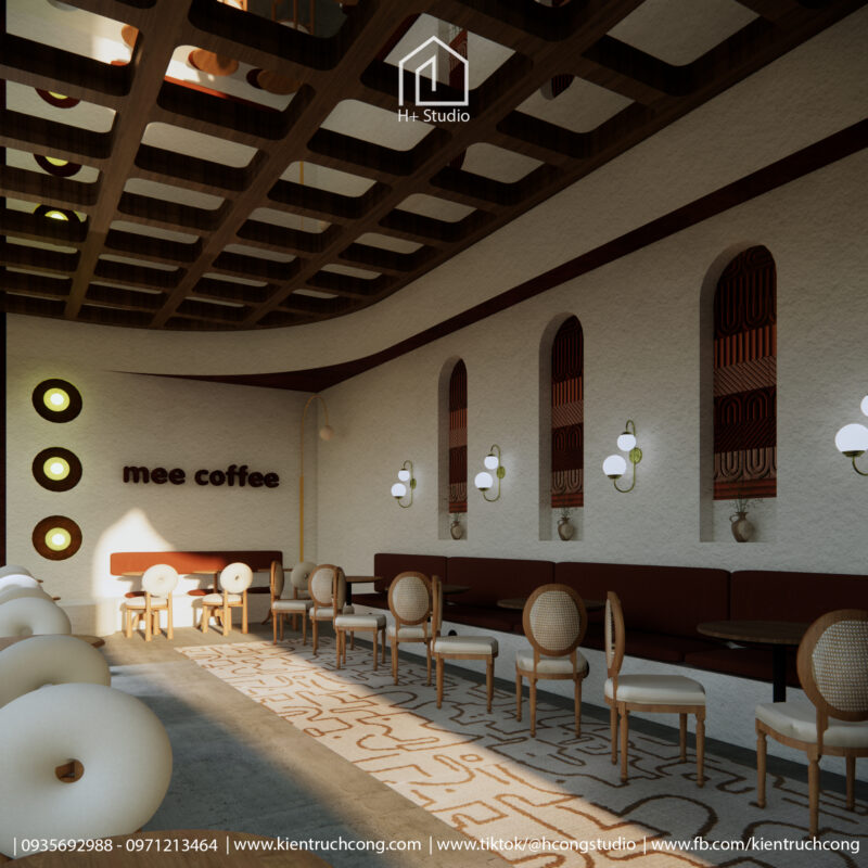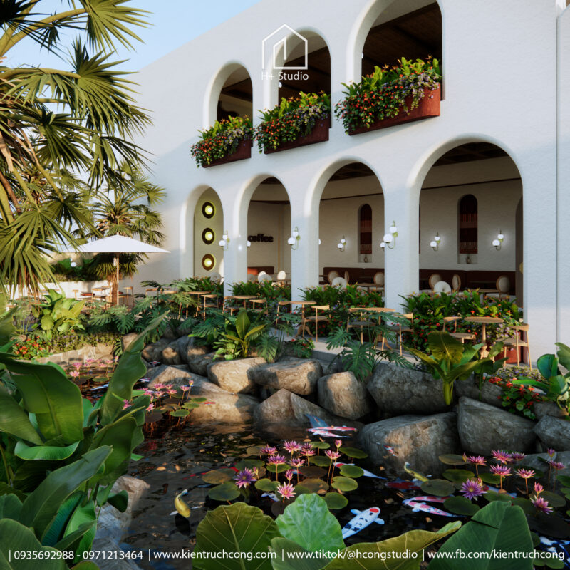 Mee Coffee là công trình do H Cộng thiết kế, kết hợp hài hòa giữa kiến trúc vòm Địa Trung Hải và không gian sân vườn xanh mát. Quán mang đến cảm giác vừa sang trọng vừa gần gũi, nơi khách hàng có thể trải nghiệm cà phê trong một khung cảnh tinh tế, đầy cảm hứng.
