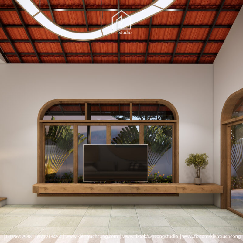 Trần cao thông thoáng với mái ngói lộ kết cấu – giúp công trình vừa mát mẻ vừa mang lại trải nghiệm không gian sống khác biệt.