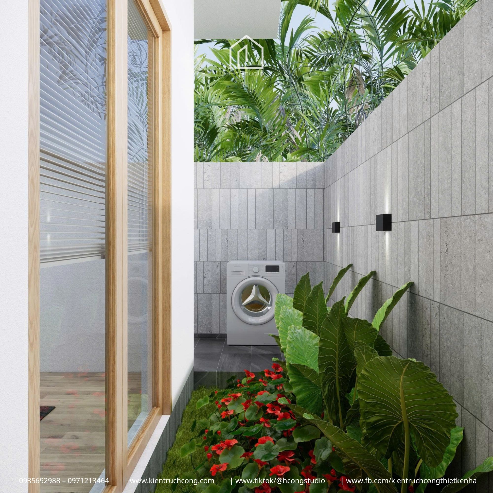 H Cộng bố trí một khoảng sân sau nhỏ ở cuối nhà, kết hợp cây xanh và khu giặt phơi trong cùng một không gian. Phòng ngủ được mở cửa lớn ra phía sân, tạo lối cho ánh sáng và gió đi thẳng vào trong phòng. Khu giặt phơi được đặt ở đây cũng hợp lý vì có nắng và thoáng khí tự nhiên, không cần thêm thiết bị hỗ trợ.