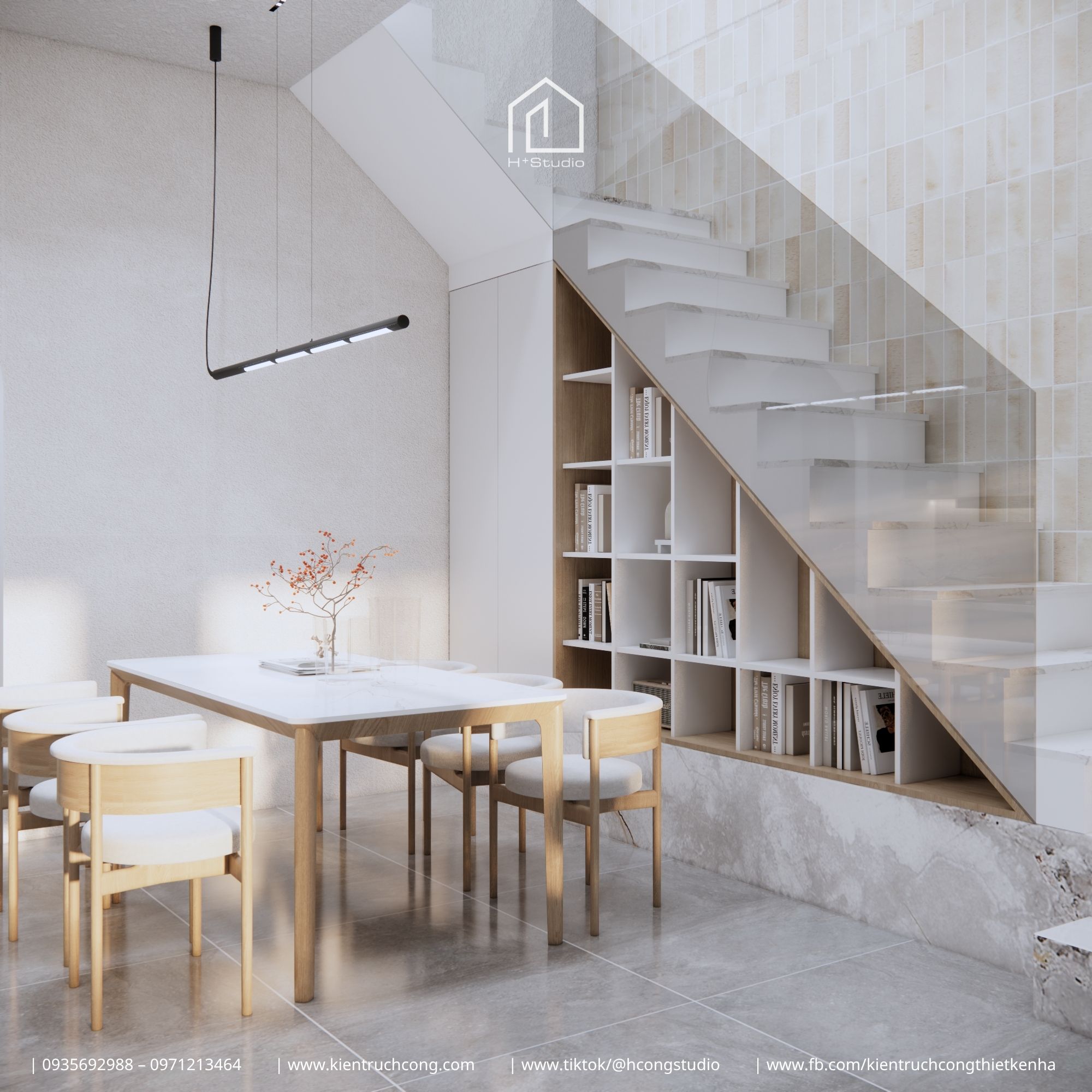 Nội thất được bố trí gọn, không có chi tiết thừa. Khoảng dưới cầu thang được tận dụng làm tủ lưu trữ, giúp tiết kiệm diện tích mà không cần thêm đồ đạc. Ánh sáng trong nhà kết hợp giữa nguồn sáng tự nhiên từ giếng trời và cửa sổ với hệ đèn bố trí âm trần, đảm bảo đủ sáng vào mọi thời điểm trong ngày.