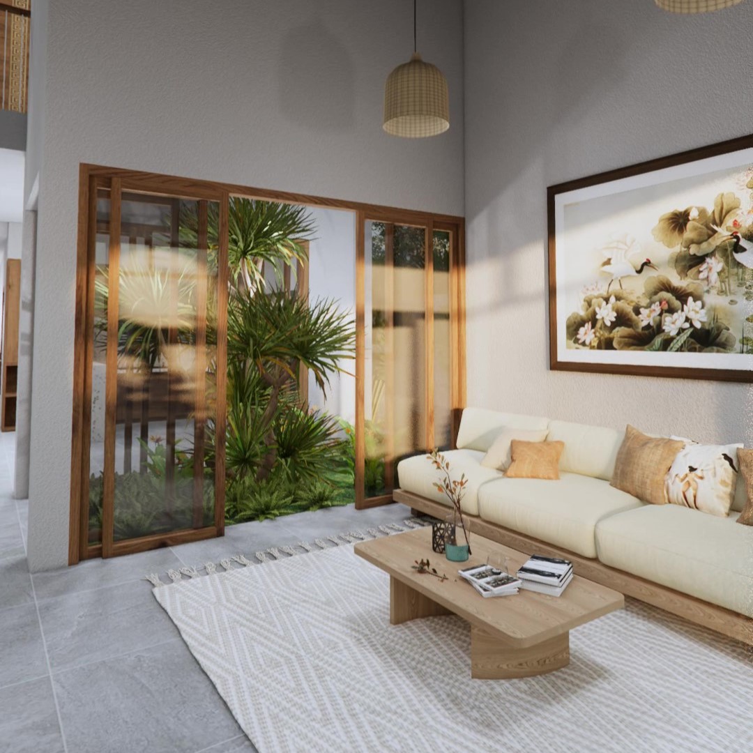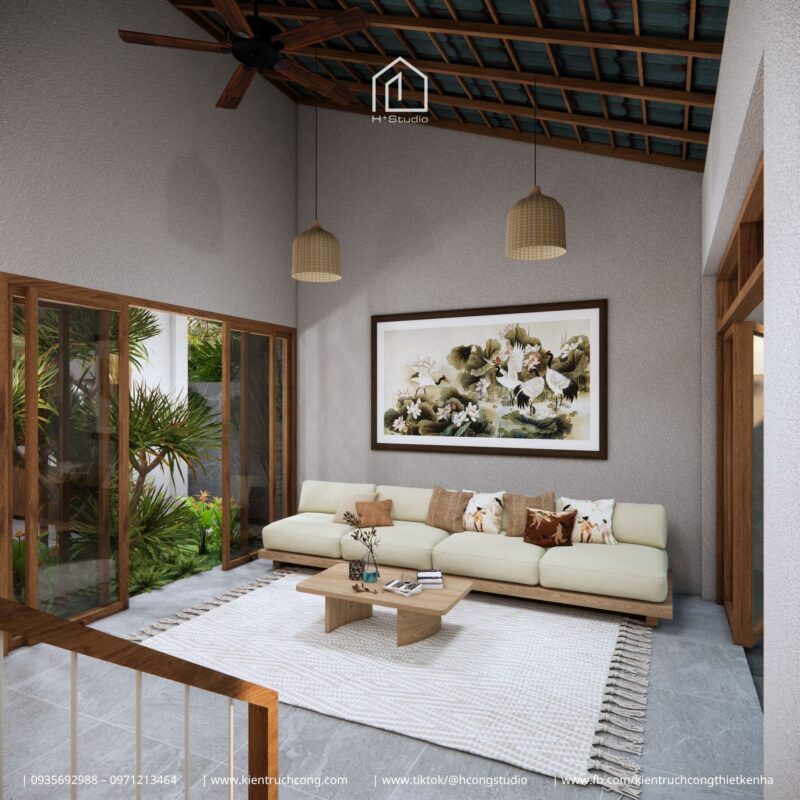 Kkhoảng thông tầng kết hợp sân vườn trung tâm, giúp không gian luôn thoáng mát, ngập tràn ánh sáng và dễ chịu khi sử dụng.