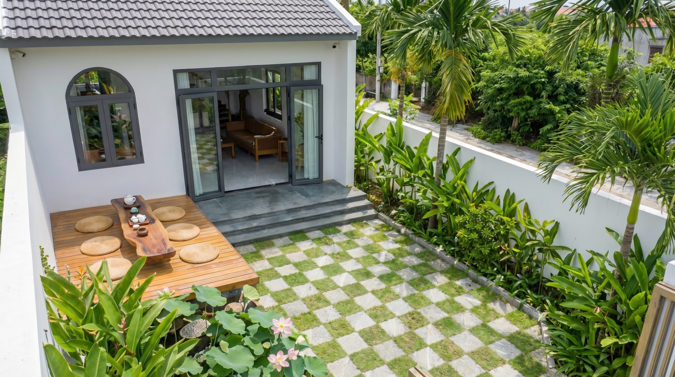 Sân trước với hồ cá và bàn trà giúp gia chủ thư giãn