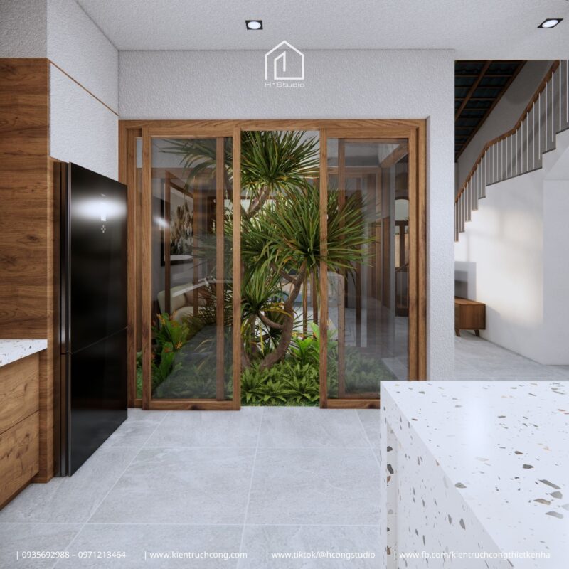 Điểm nhấn quan trọng nhất nằm ở khoảng thông tầng được đặt giữa nhà, kết nối trực tiếp phòng khách, bếp và tầng lửng. Tại đây, một mảng cây xanh lớn được bố trí như “lá phổi” sống động của toàn bộ công trình. Từ phòng khách lẫn bếp, thậm chí từ tầng lửng, mọi góc nhìn đều có thể hướng về khoảng xanh trung tâm này.