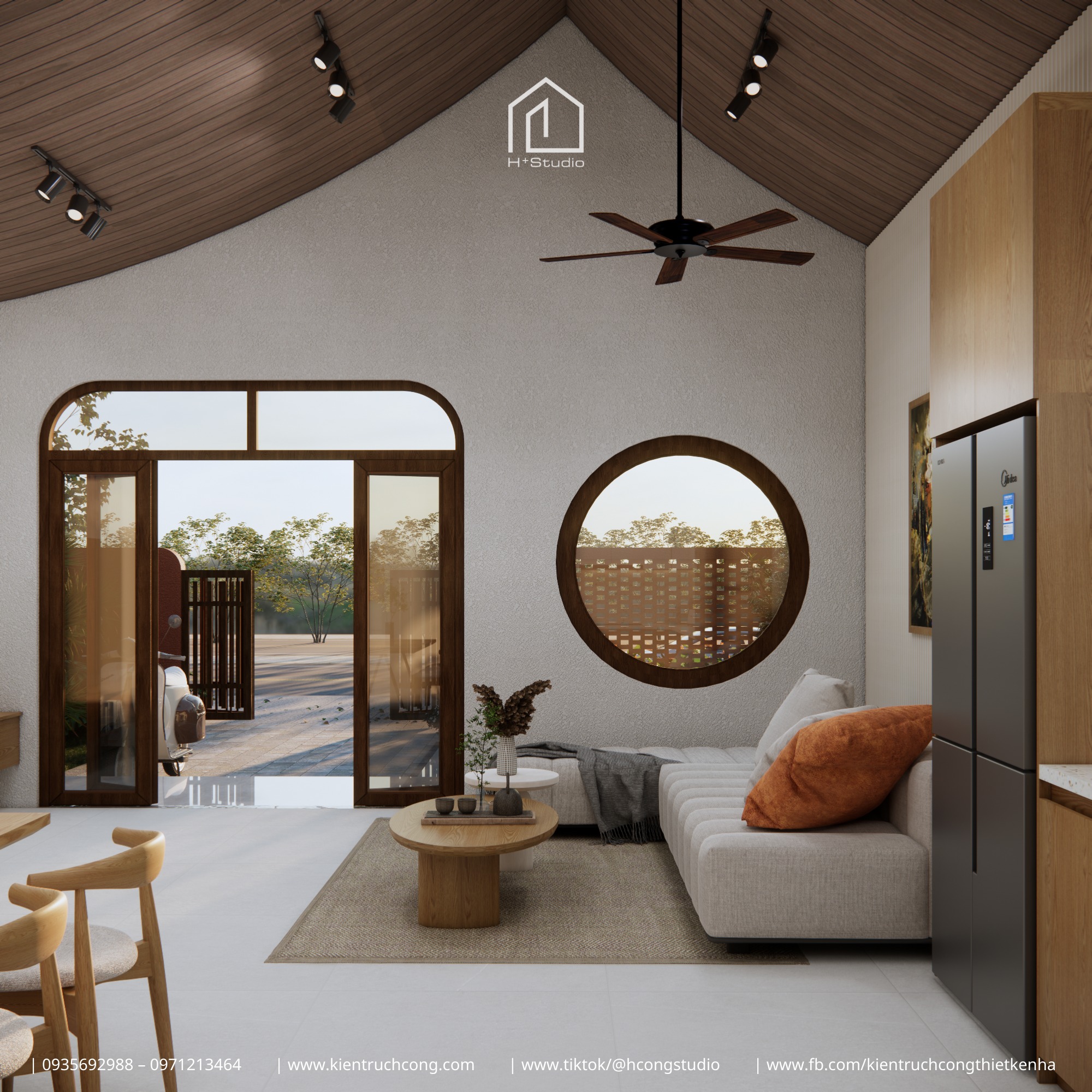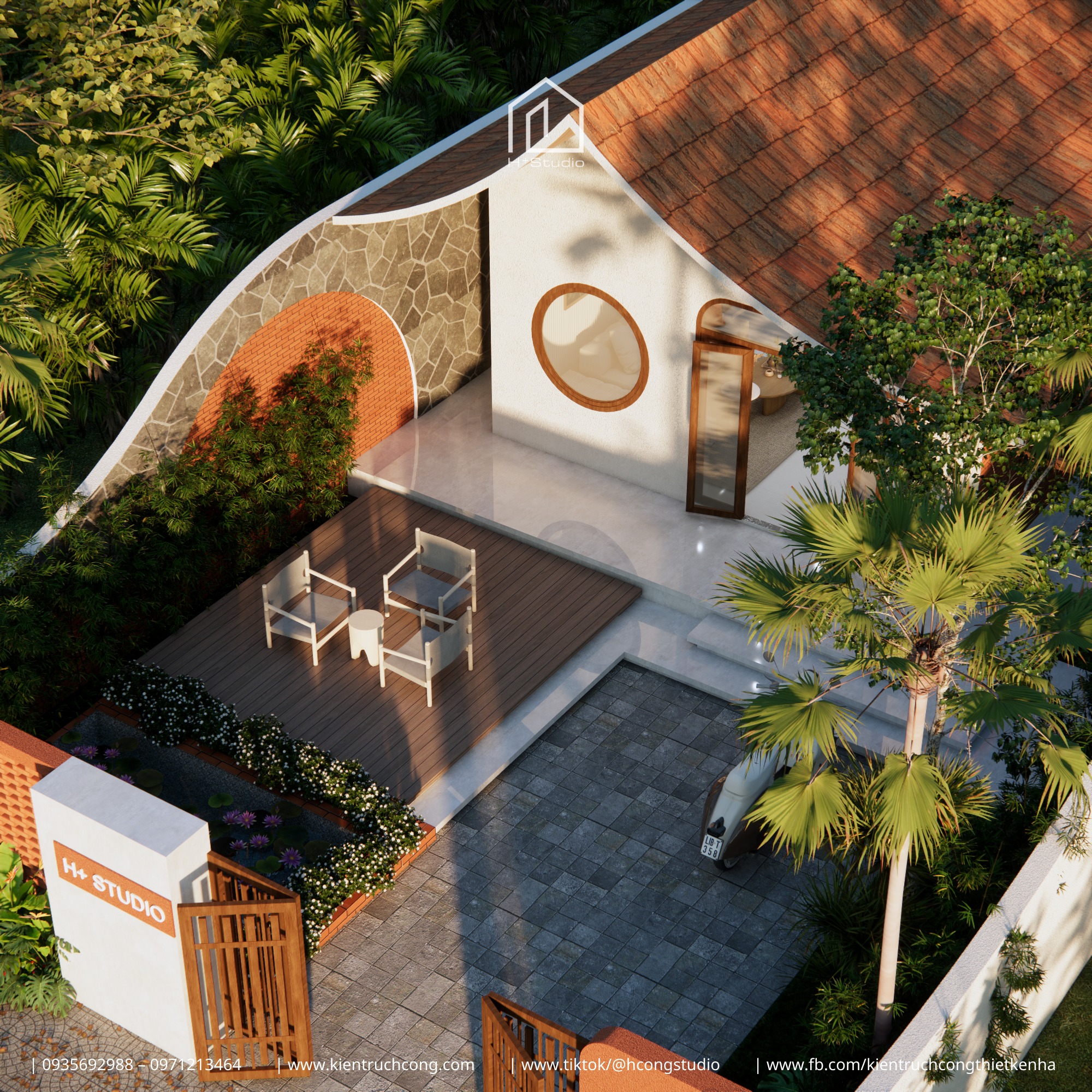 H Cộng xử lý mái theo đường cong nhẹ tạo nên đường nét mềm mại và ấn tượng hơn so với mái thẳng thông thường. Vật liệu ngói vẫn quen thuộc, nhưng hình dáng thì hoàn toàn khác. Chính đường cong của mái dẫn đến cách xử lý toàn bộ ngôn ngữ kiến trúc còn lại: tường bao uốn cong nhấn lại hình dáng mái, cửa sổ tròn tạo điểm nhấn hình học, các ô cửa và lối đi thiết kế dạng vòm để đồng bộ với nhau.
