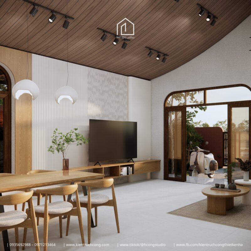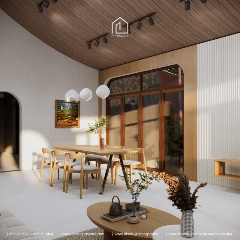 Trần ốp gỗ theo hình mái cong, cao hơn nhà cấp 4 thông thường, giúp không khí lưu thông và không gian nhìn rộng hơn thực tế. Sân vườn, đường luồng và trần cao cùng tạo nên một không gian bên trong sáng và thoáng mà không cần phụ thuộc vào thiết bị điện.