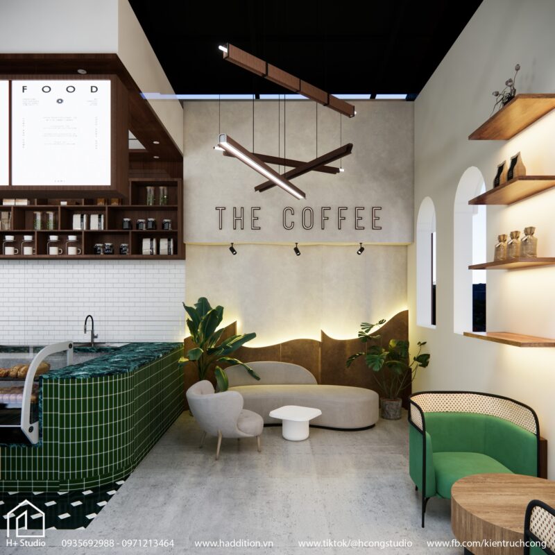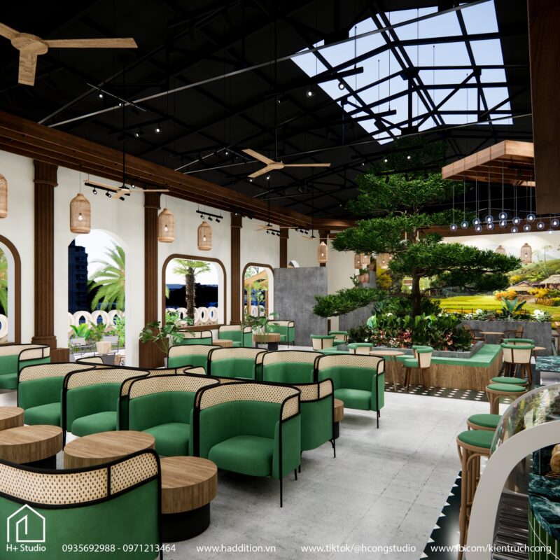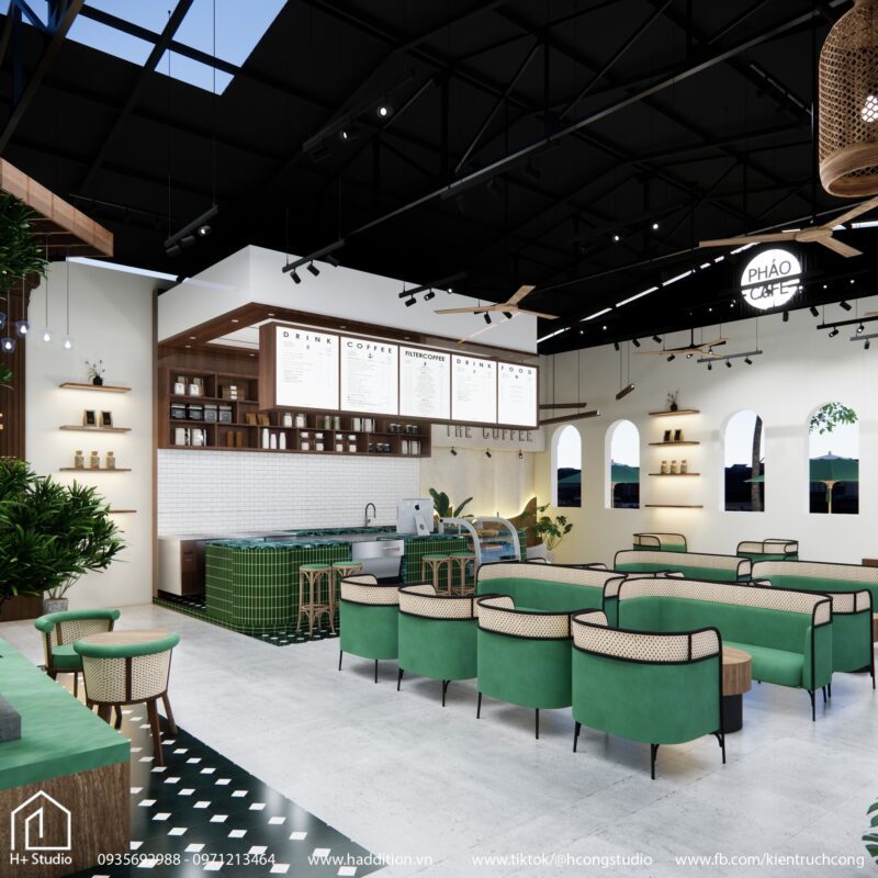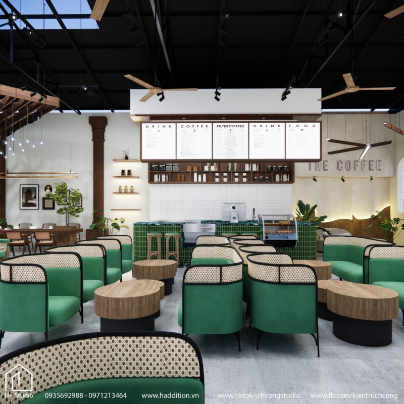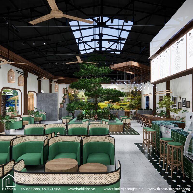 Bước vào bên trong, bạn sẽ ngay lập tức bị ấn tượng bởi không gian mở với những ghế sofa màu xanh lá cây lưng ghế đan lát đầy nghệ thuật, cùng những bàn gỗ ấm áp. Trần nhà cao thoáng đãng với các đèn treo và quạt trần không chỉ mang đến ánh sáng tự nhiên mà còn tạo cảm giác mát mẻ, dễ chịu. Quầy pha chế nổi bật với bảng menu lớn liệt kê đầy đủ các loại đồ uống và thức ăn hấp dẫn.