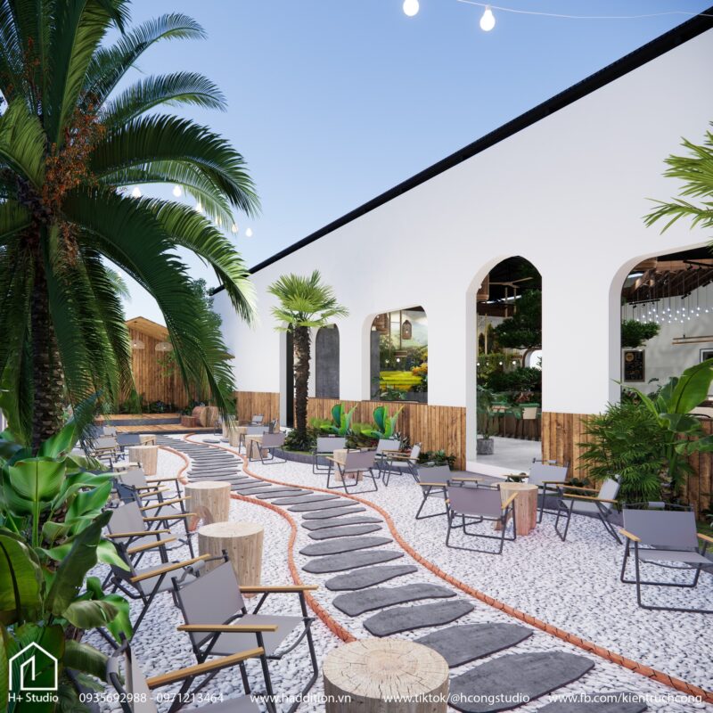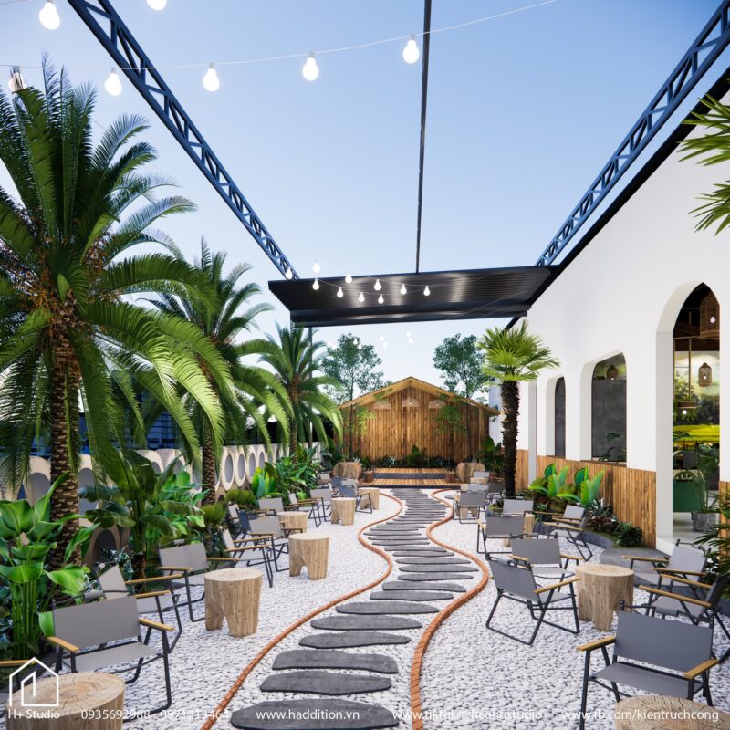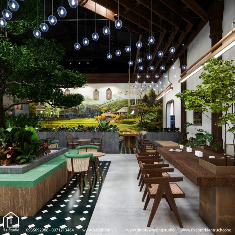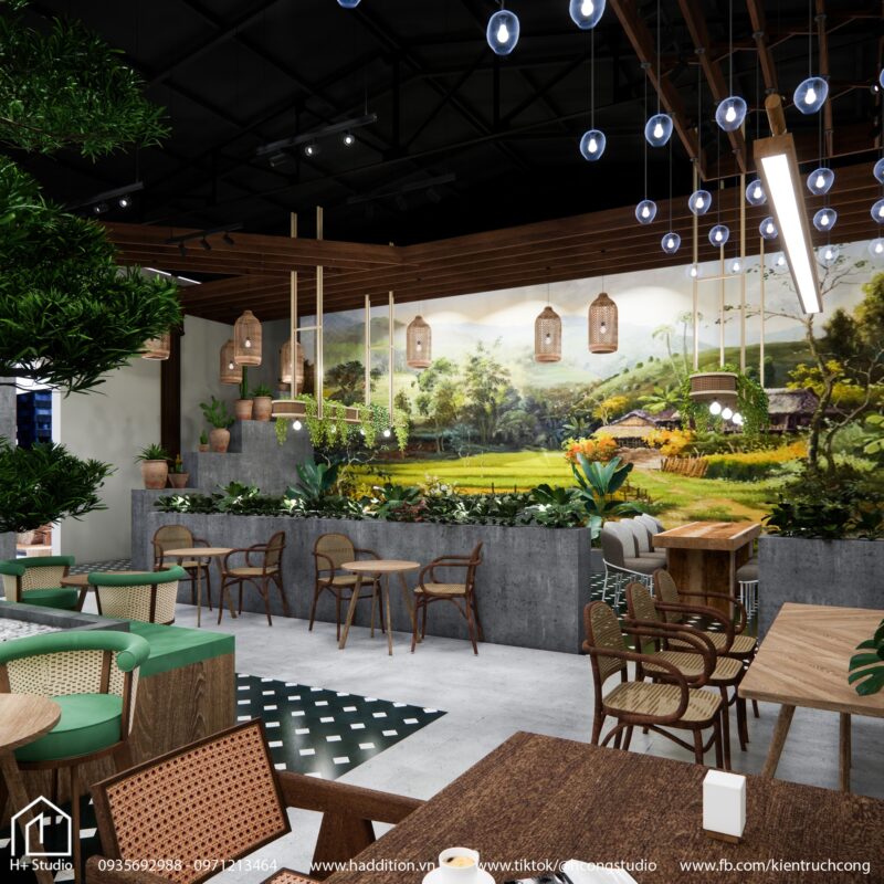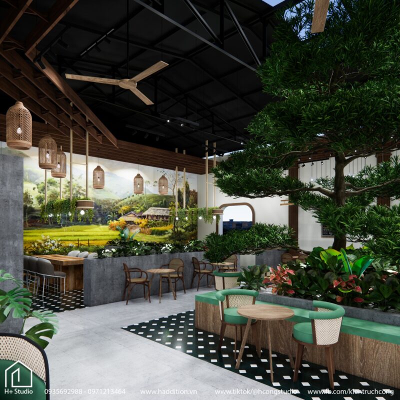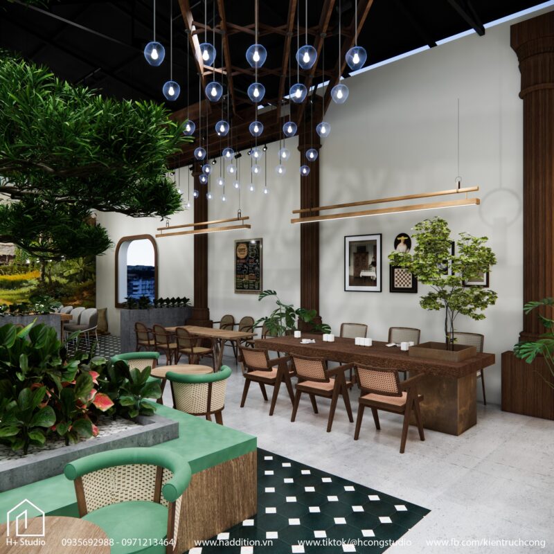 Bước vào bên trong, bạn sẽ ngay lập tức bị ấn tượng bởi không gian mở với những ghế sofa màu xanh lá cây lưng ghế đan lát đầy nghệ thuật, cùng những bàn gỗ ấm áp. Trần nhà cao thoáng đãng với các đèn treo và quạt trần không chỉ mang đến ánh sáng tự nhiên mà còn tạo cảm giác mát mẻ, dễ chịu. Quầy pha chế nổi bật với bảng menu lớn liệt kê đầy đủ các loại đồ uống và thức ăn hấp dẫn.