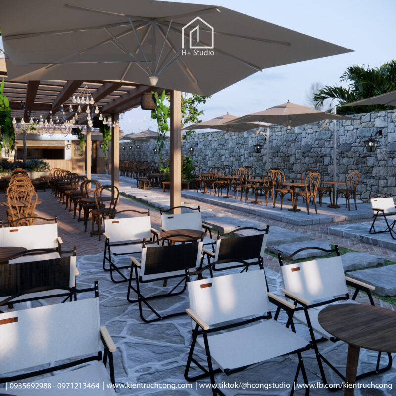 Không gian ngoài trời được bố trí theo 3 cụm bàn ghế: ghế khung sắt, ghế mây và ghế gỗ kiểu Indochine – tạo sự đa dạng và linh hoạt khi vận hành