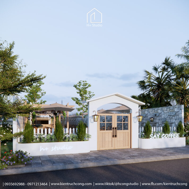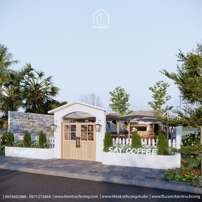 Mặt tiền nổi bật với cổng vòm gỗ, hàng rào trắng và bảng hiệu tay viết – gợi nhớ hình ảnh nhà vườn Pháp cổ