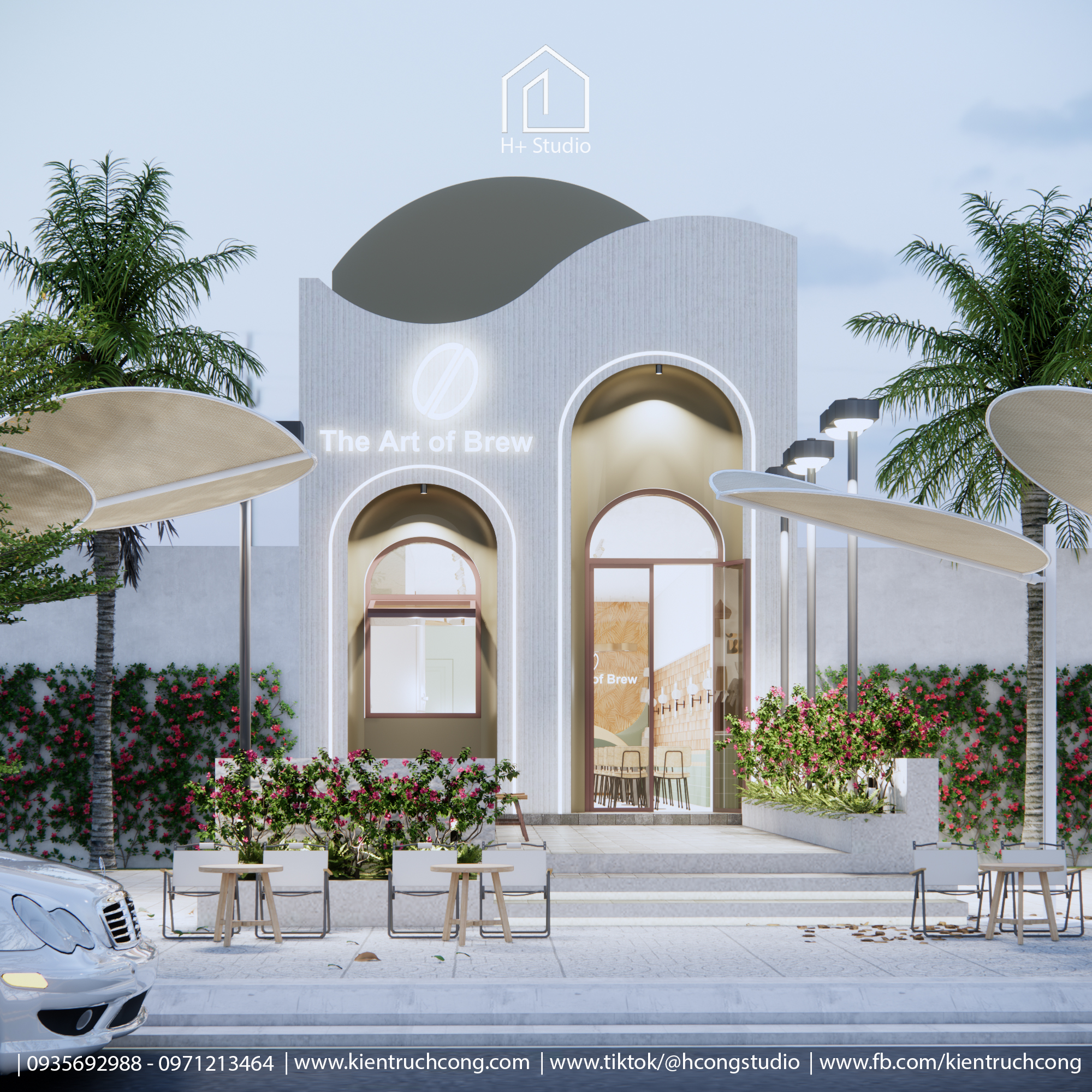 Mặt tiền nổi bật với cổng vòm gỗ, hàng rào trắng và bảng hiệu tay viết – gợi nhớ hình ảnh nhà vườn Pháp cổ