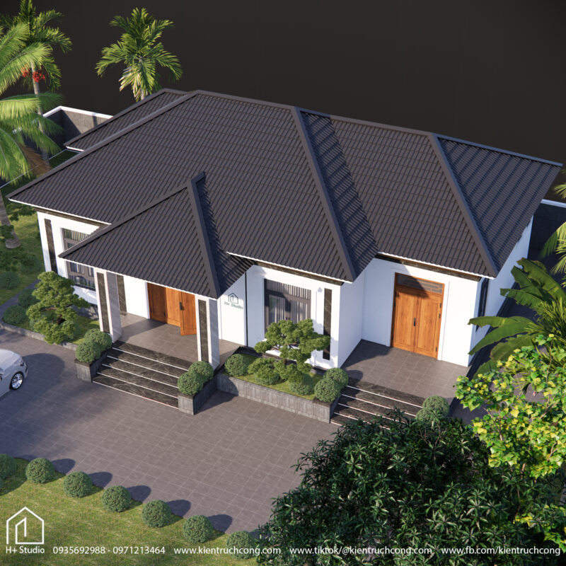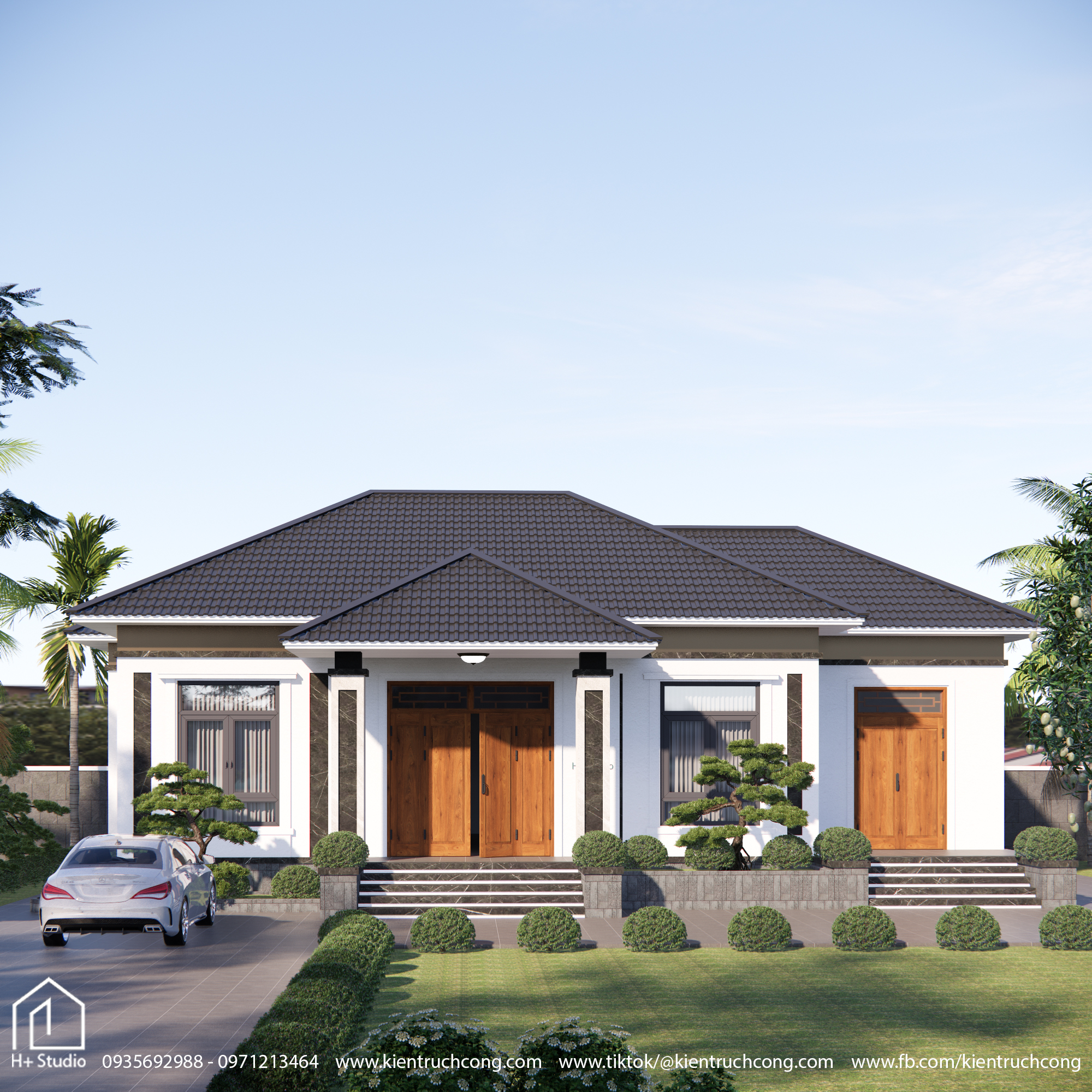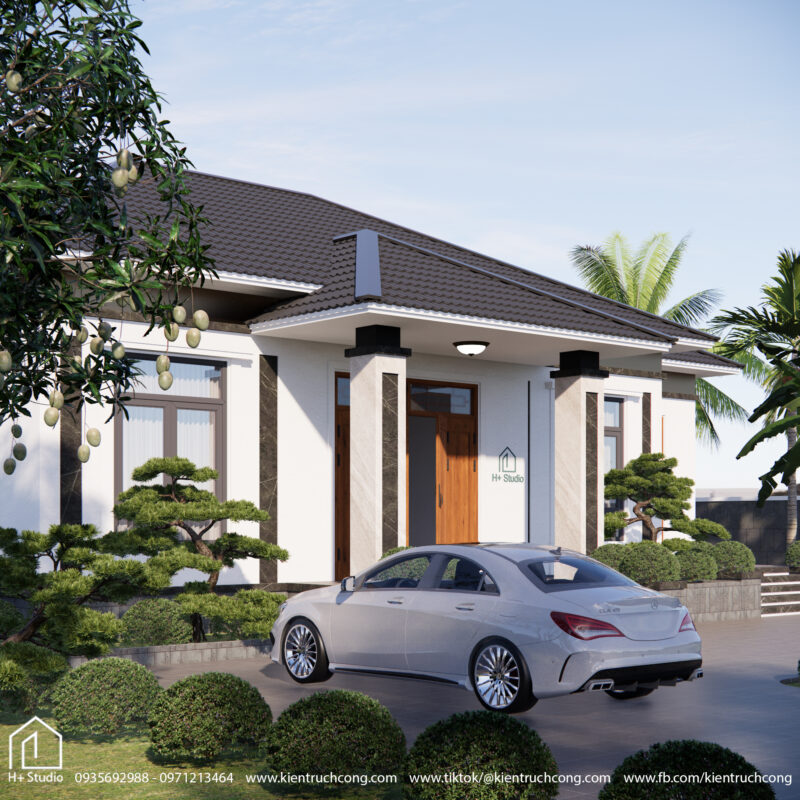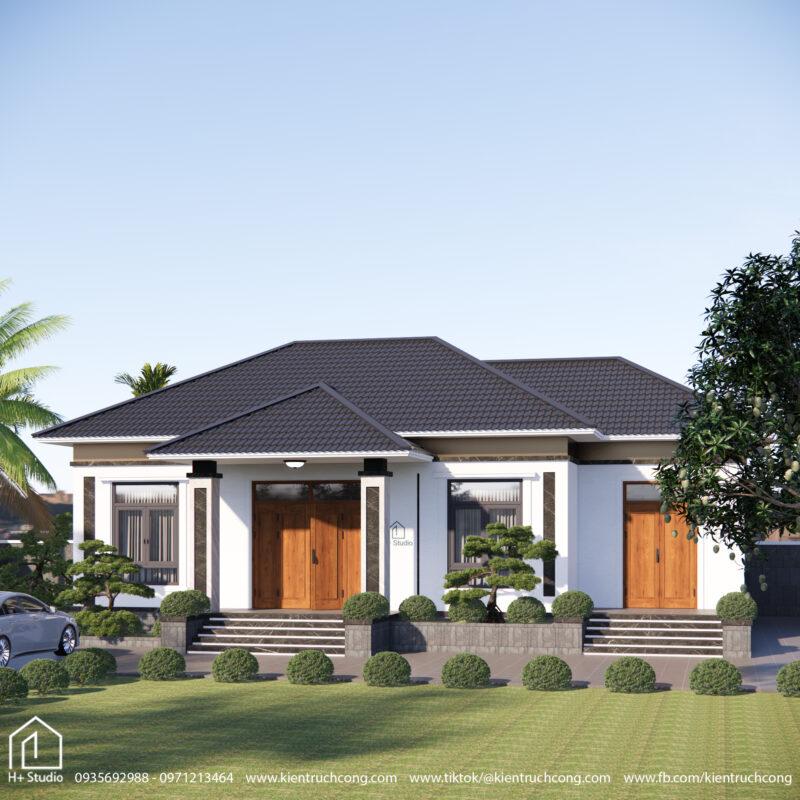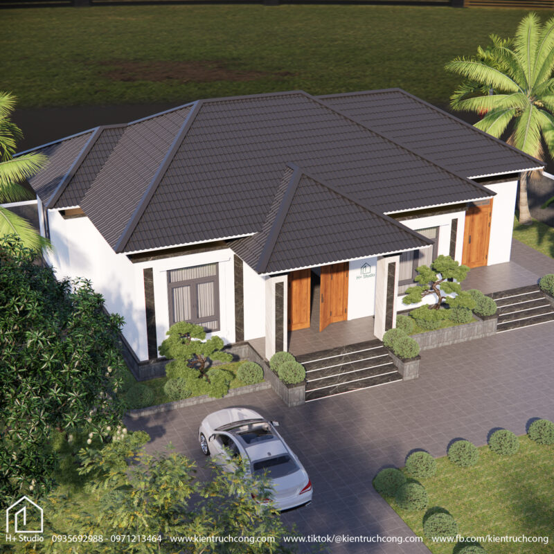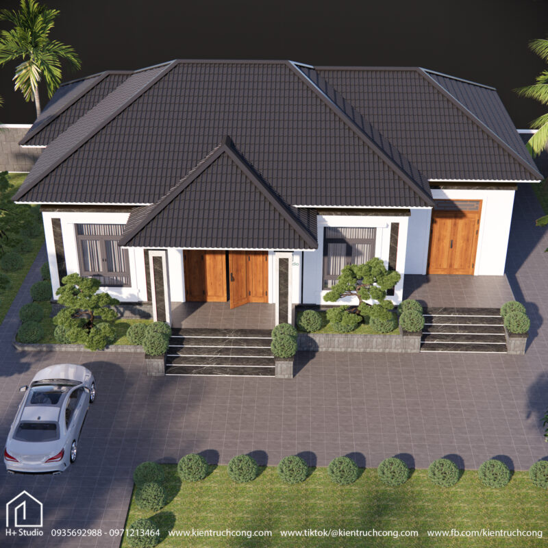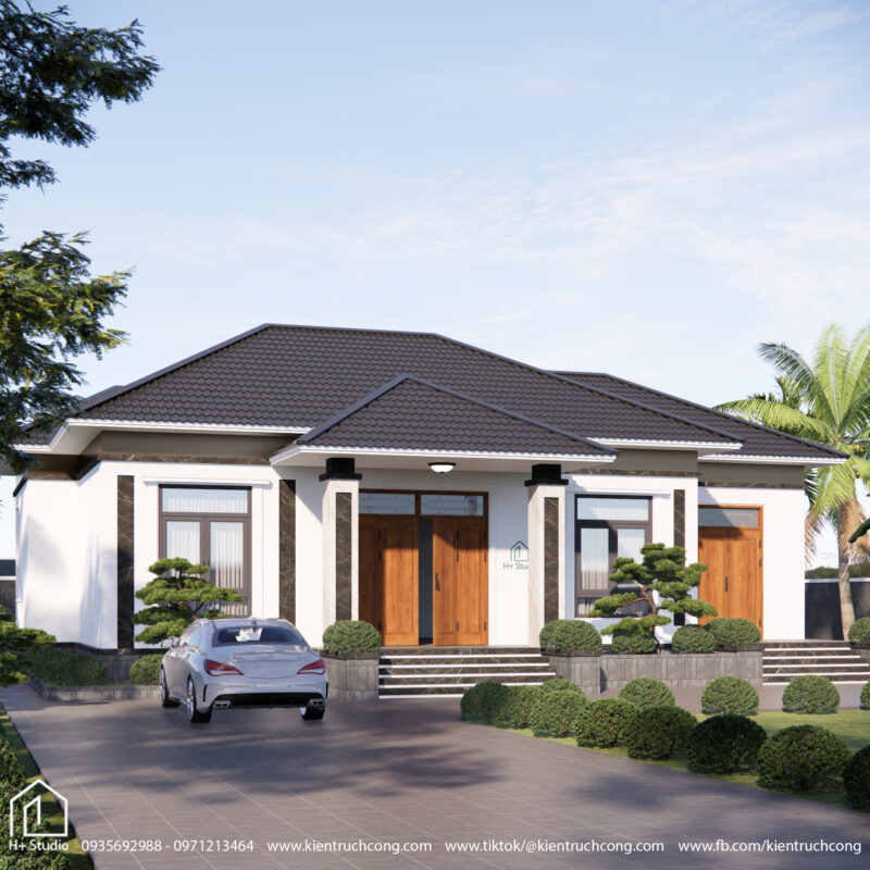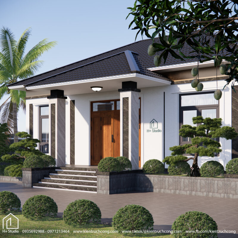 Từ mái ngói đen sang trọng đến cửa gỗ lớn ấm áp, tất cả hòa quyện tạo nên một tổ ấm lý tưởng. Xung quanh là cây xanh và lối đi lát gạch gọn gàng, mang lại cảm giác thư thái mỗi khi trở về.