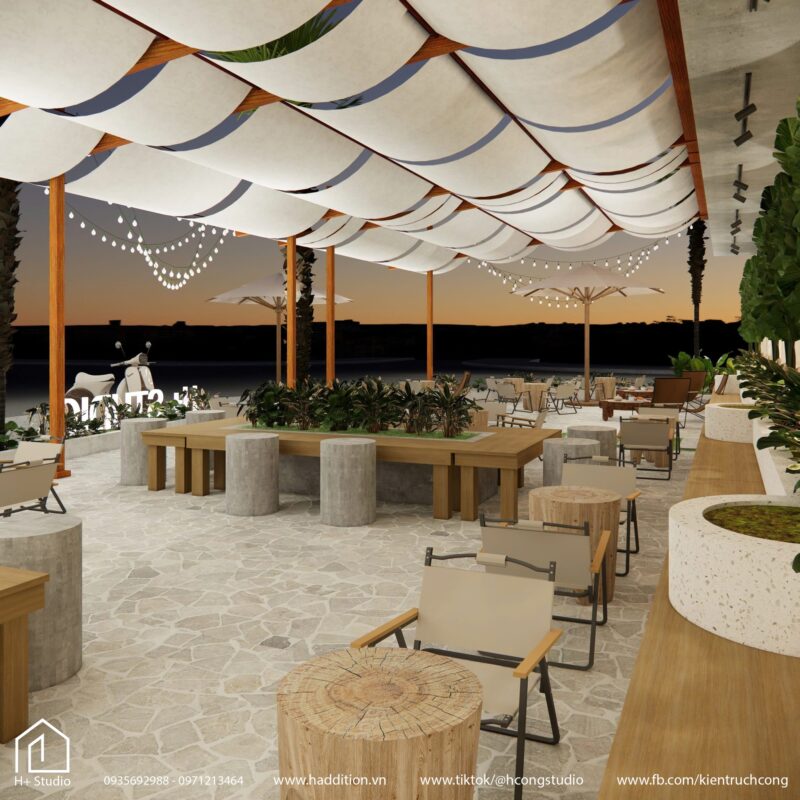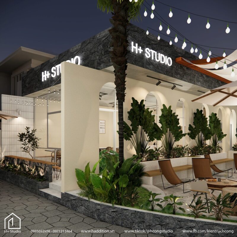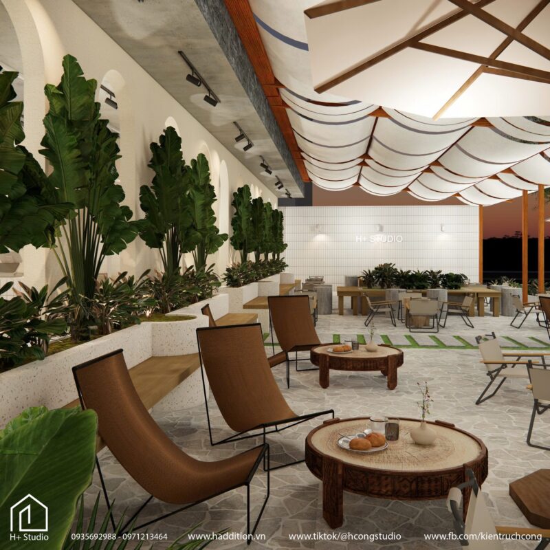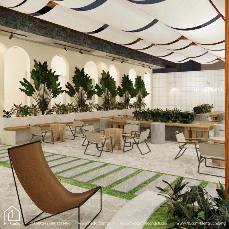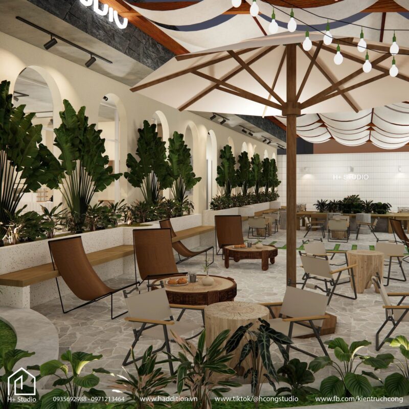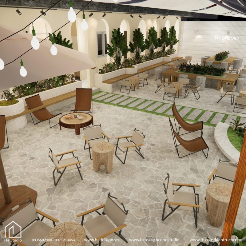 Toàn bộ quán được thiết kế với tone màu trắng chủ đạo và vật liệu đơn giản, mang lại sự tinh tế và thanh thoát. Bạn sẽ được hòa mình vào không gian sân vườn xanh mát, nơi những chiếc lá xào xạc và những cánh hoa thơm ngát tạo nên một bức tranh hoàn hảo cho mọi khoảnh khắc.